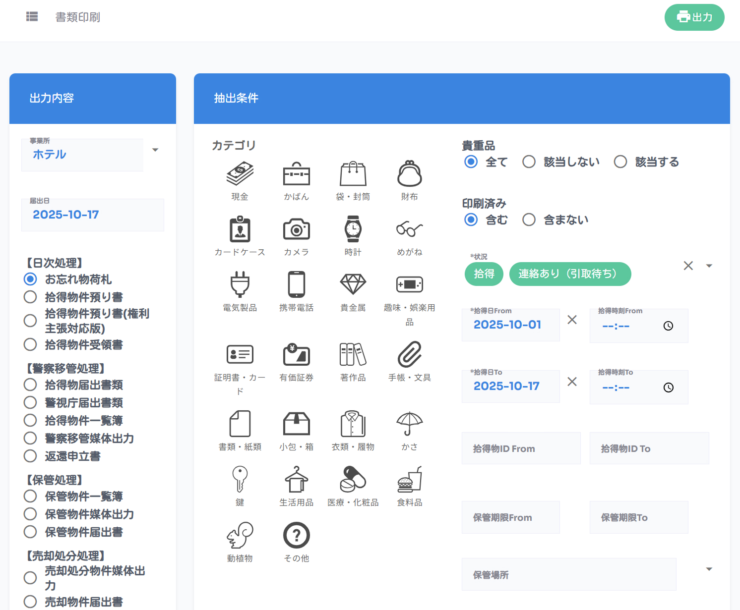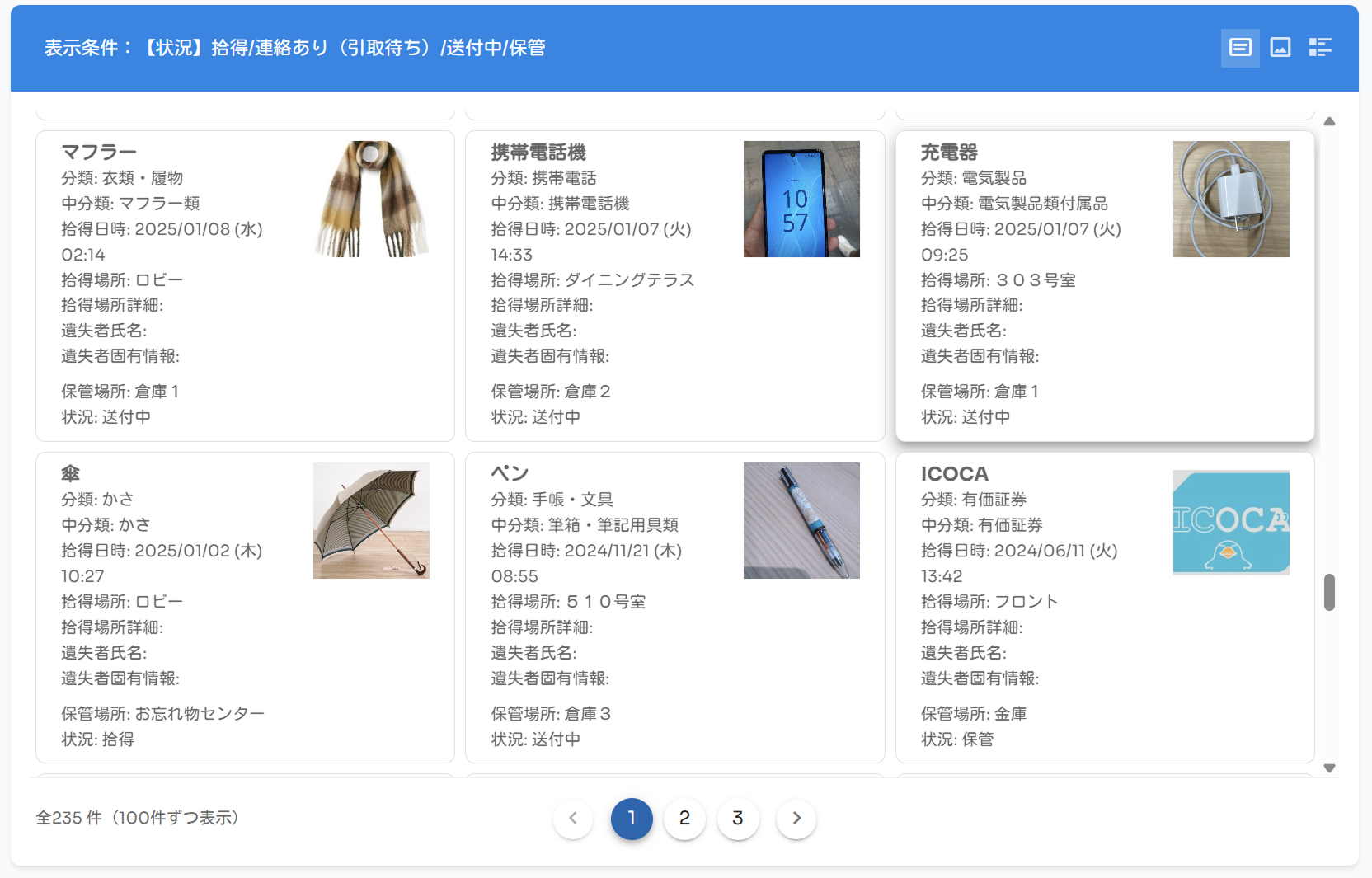 忘れ物は写真と一緒にデジタルで管理。 日付、カテゴリ、フリーワード検索に対応。